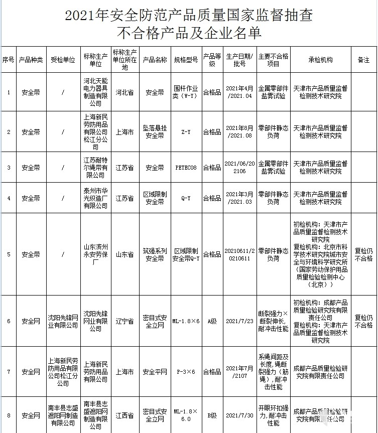 12月13日,市场监管总局发布2021年安全防范产品质量国家监督抽查情况,本次抽查了228家企业生产的238批次产品,涉及安全带、安全网、锁具、人民币鉴别仪等4种安全防范产品,共发现12批次产品不合格,不合格发现率为5.0%。本次跟踪抽查到上次不合格企业8家,有1家企业本次抽查仍不合格,7家企业合格。